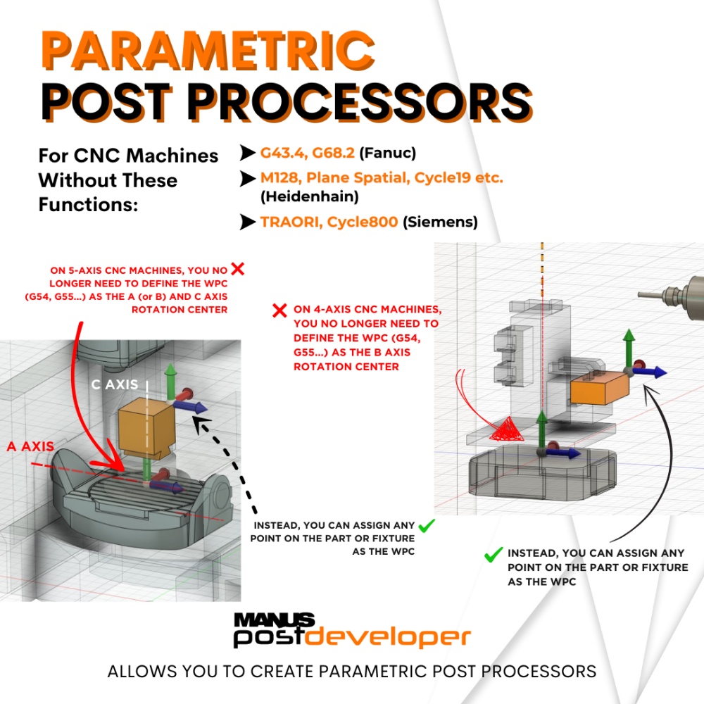 Parametric post processor is special post processor developed by MANUS for multi-axis CNC machines that do not have any active Tcpc (G43.4, M128, Traori) or plane rotating (Plane Spatial, Cycle800, G68.2) functions in their NC controller.