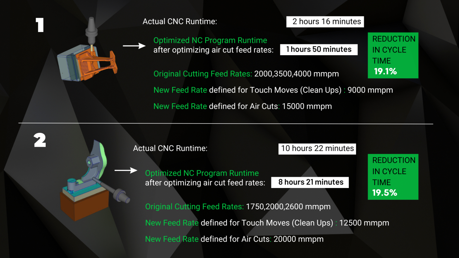 In our tests, we’ve seen dramatic improvements in efficiency. The key metric we’ve focused on in these test is air cut feed rate optimization, which refers to optimizing non-cutting movements to reduce cycle time using the first module of MANUSsim optimize. Here are some of the impressive results: