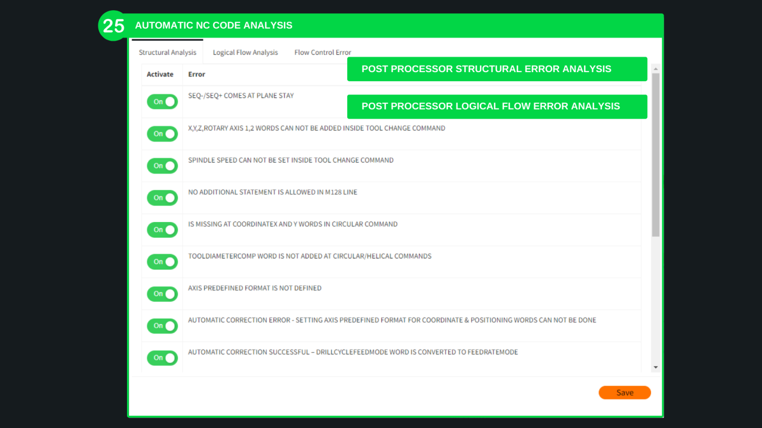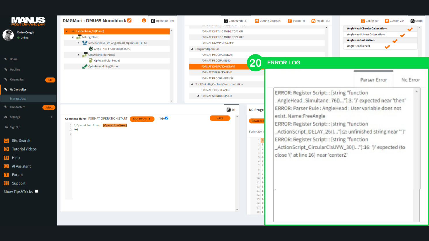 25. Don’t be afraid to modify your post-processors! Each post-processor in MANUSpost undergoes automatic NC code analysis, which later issues automatic warnings based on this analysis. To accomplish this, we define various error checks within each post-processor. These predefined error checks will recognize possible errors that may occur after you modify your post-processor and will warn you in advance.