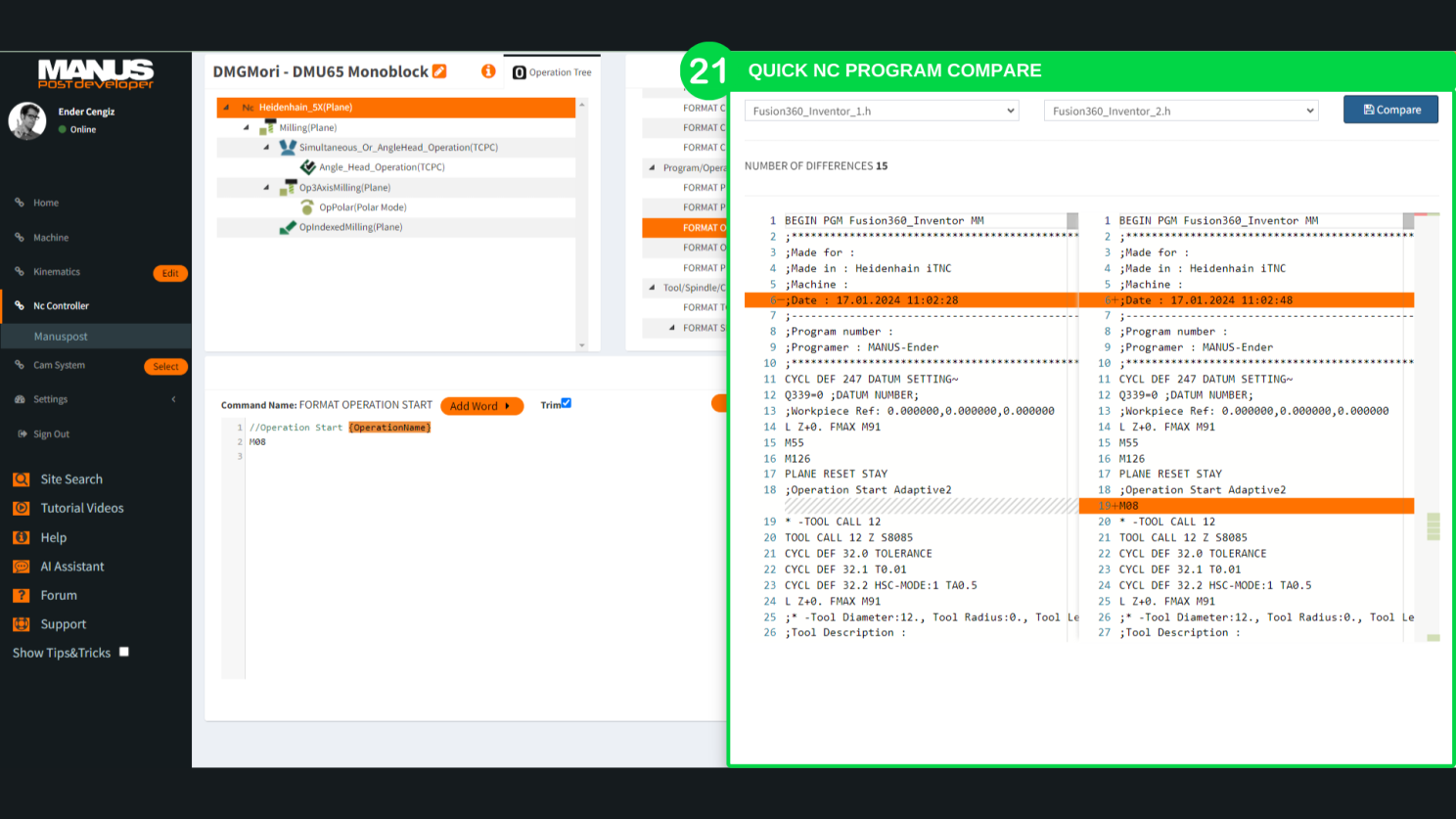 21. Quick NC program comparison feature highlights the differences between G codes and counts the number of changes between 2 NC programs.