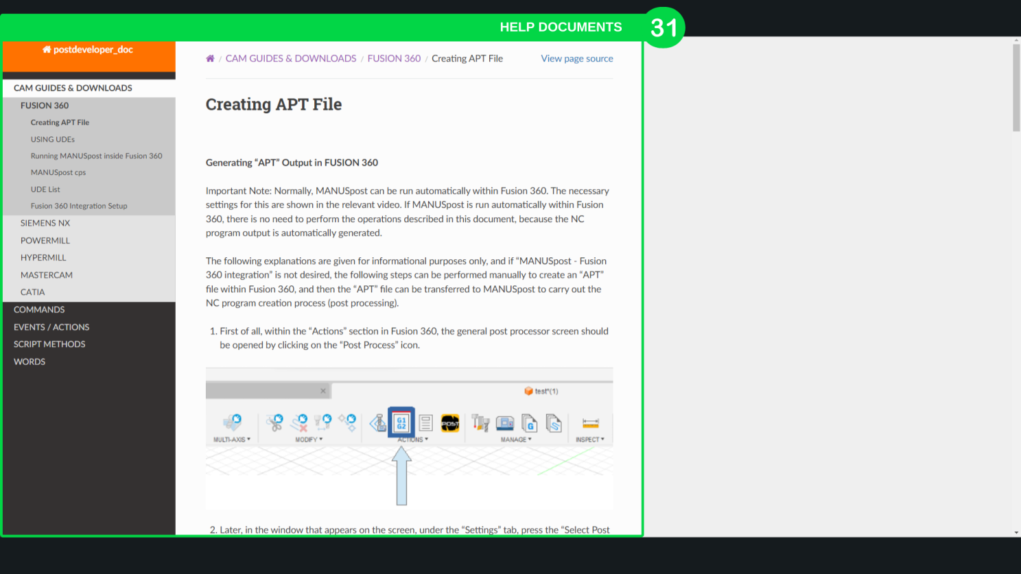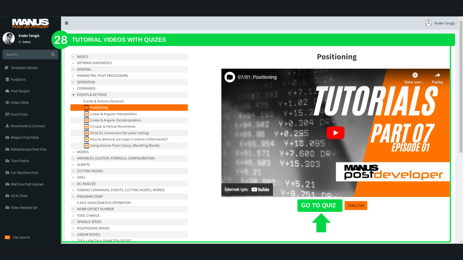 28. MANUSpost developer has over 80 detailed tutorial videos, each accompanied by its respective quiz. Completion of these quizzes is mandatory in order to receive the Post Processor Expert certificate.